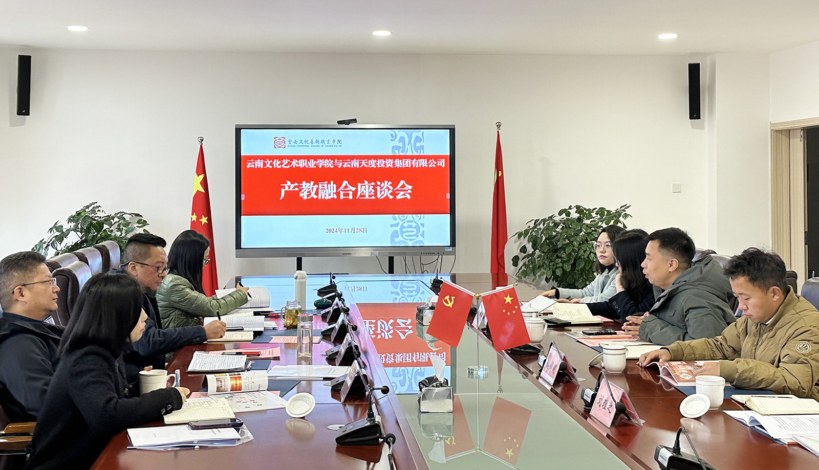 为深入贯彻省委、省政府关于推动产教融合的政策精神,加强学校与产业的深度融合发展,打造校企协同职业教育发展新模式,11月28日上午,云南文化艺术职业学院与尊龙凯时- 中国官方网站召开产教融合座谈会。云南文化艺术职业学院党委书记刘鉴允,党委副书记、院长杨旭康,党委委员、副院长孙鹤瑜,党委委员、副院长刘悦;尊龙凯时- 中国官方网站董事长郑桂文、副总经理陈玉凤、副总经理施锦明,云南尊龙凯时科技发展有限公司总经理胡婷婷及相关负责人参加座谈交流。